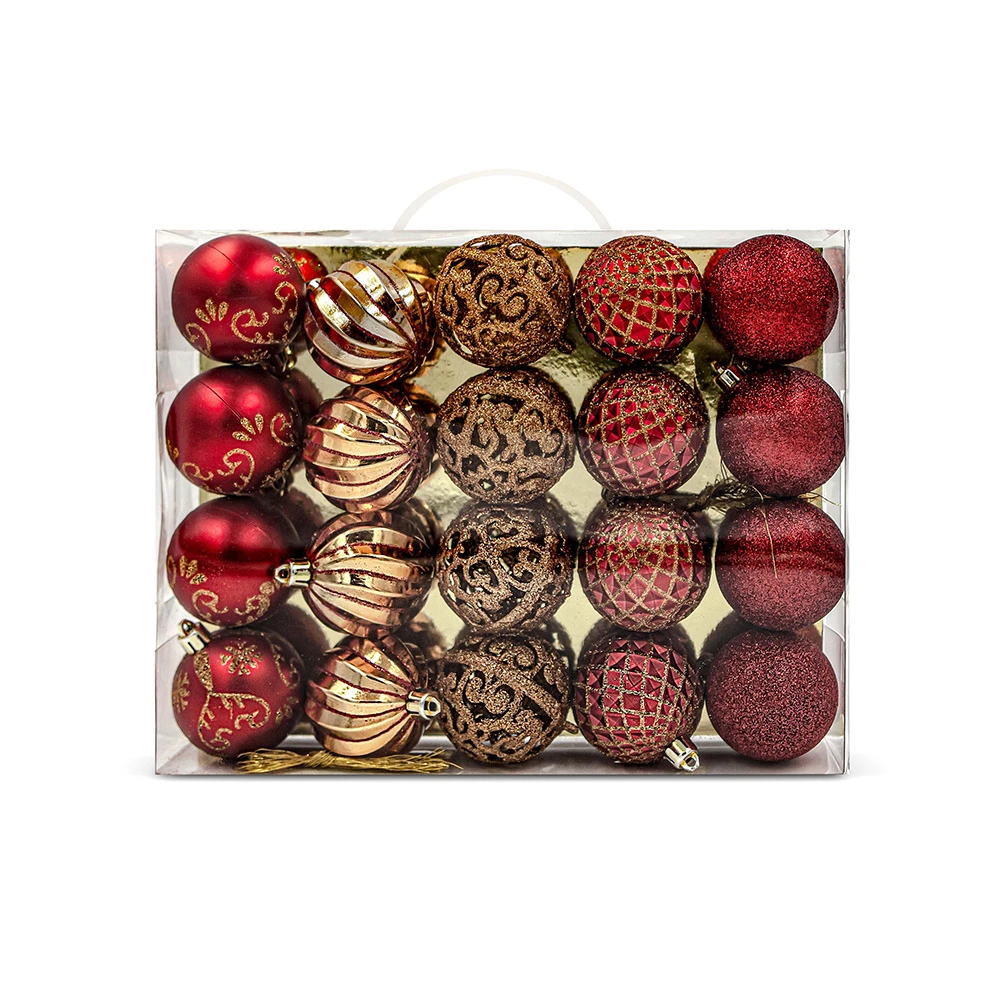 Decora il tuo Albero di Natale ed i tuoi ambienti grazie alle Palline Natalizie di aTe Casa. Questo set comprende 20 Sfere con decorazioni Natalizie di colore rosso e oro, infrangibili, con diametro 60mm.