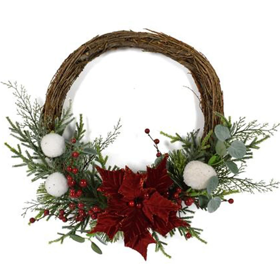 Corona Fuoriporta con Fiore Rosso. Elegante fuoriporta con Stella di Natale e rametti di pino, con diametro 40 cm.