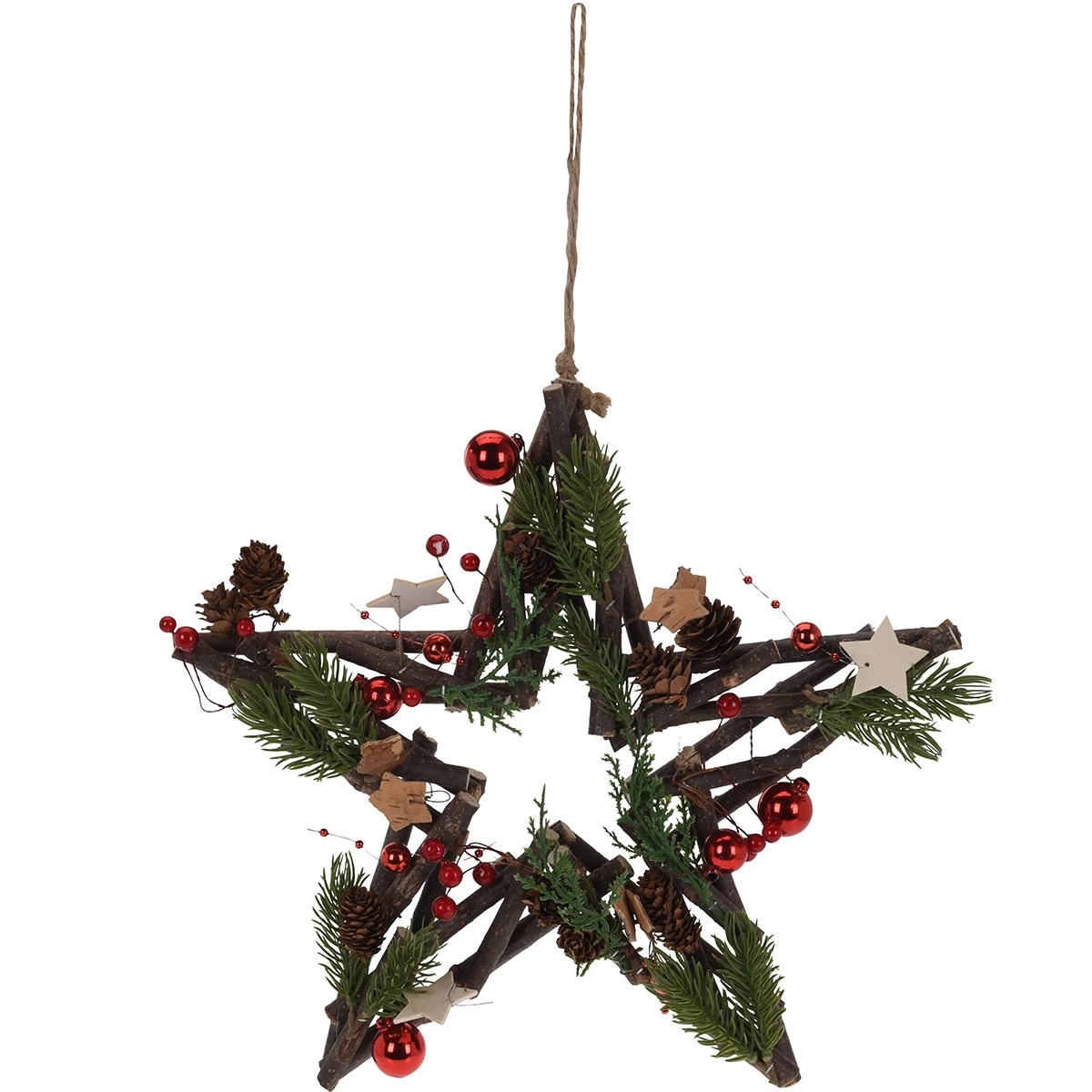 Questo Fuoriporta a forma di Stella, realizzato in legno e decorato con rametti di pino e palline, è la soluzione ideale per addobbare con stile e raffinatezza la tua portina di casa durante il magico periodo delle festività natalizie.