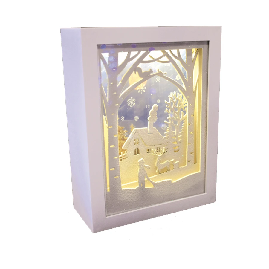 Il Quadretto Natalizio Bianco Luminoso Carillon e Paesaggio 3D a Batteria di Prequ è un quadro luminoso che misura 15×20 cm a luce calda con un paesaggio 3D all’interno. È inoltre dotato di carillon! Porta la magia del Natale nella tua casa con questo quadretto!